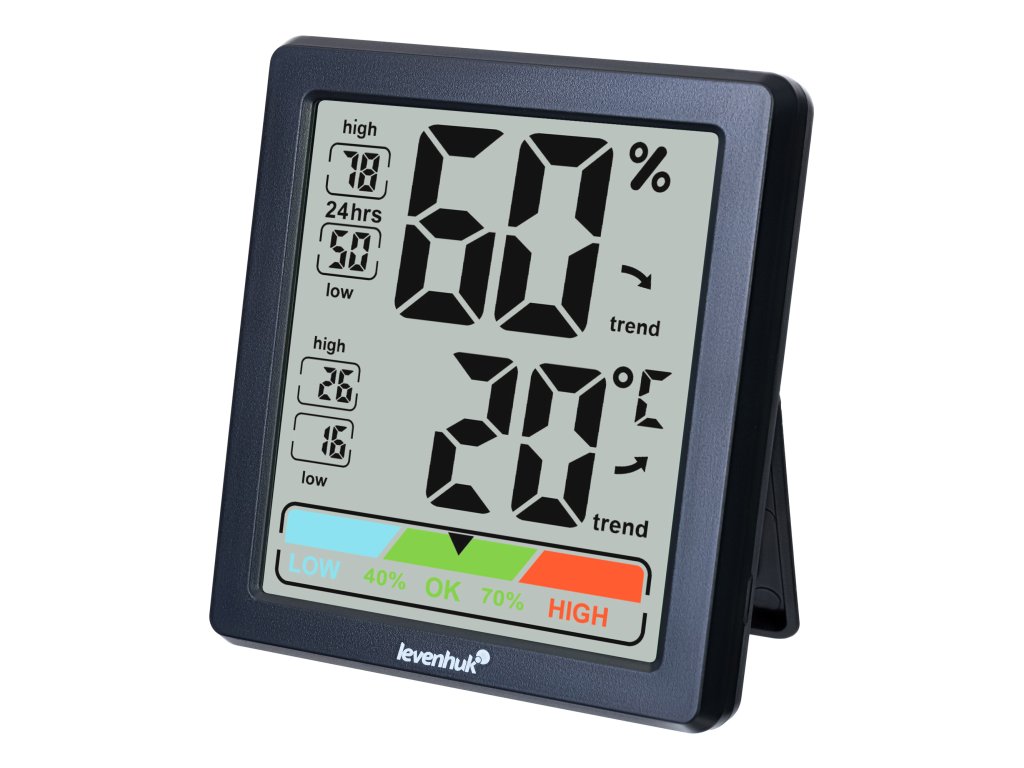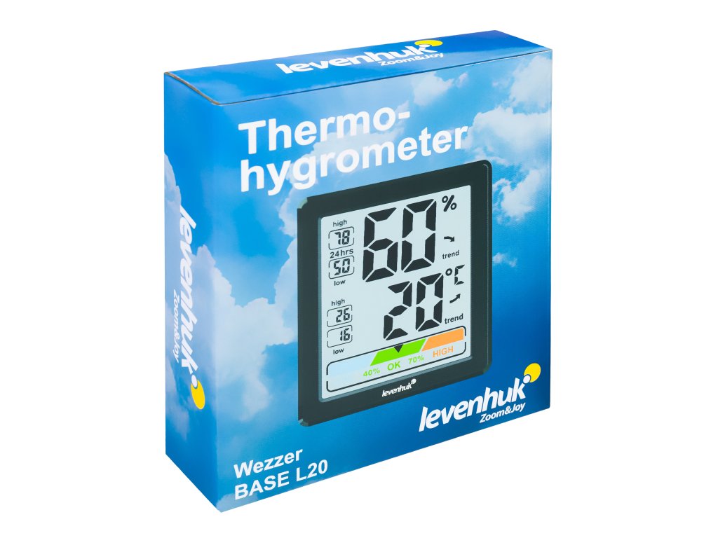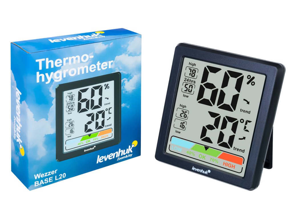 Termohygrometr Levenhuk Wezzer BASE L20 je kompaktní přístroj pro montáž na stěnu. Měří teplotu a vlhkost vzduchu v místnosti a zaznamenává nejvyšší a nejnižší hodnoty. Zobrazuje také trendy, které indikují změny parametrů počasí. Poskytuje tak vynikající možnost sledovat změny mikroklimatu v ložnici, dětském pokoji, kancelářské místnosti nebo venkovském domě.