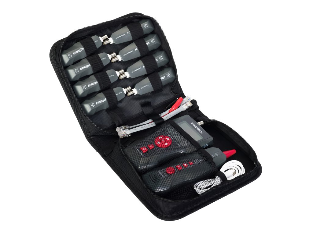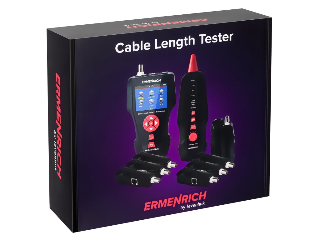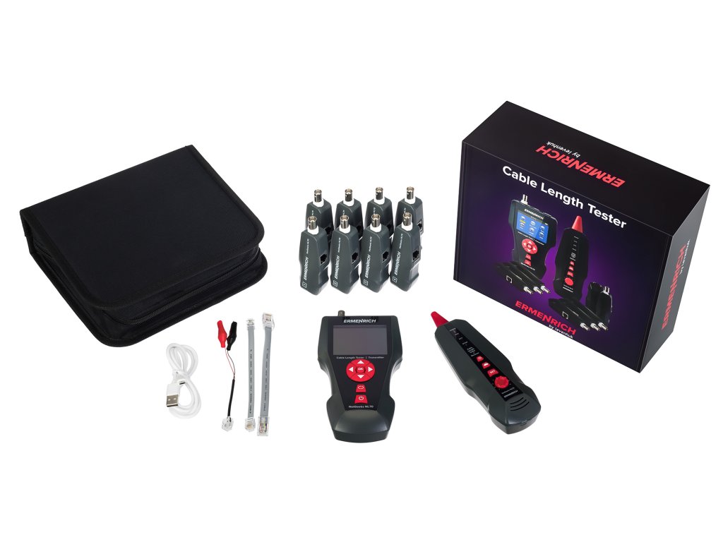Tester délky kabelů Ermenrich NetGeeks NL70 je multifunkční měřicí přístroj pro testování různých síťových kabelů (kategorie 5E/6E), telefonních, koaxiálních kabelů a běžných vodičů. Přístroj se používá k testování kabelů o délce až 1 000 metrů. Sada obsahuje 8 vzdálených jednotek, které umožňují 8 současných měření.