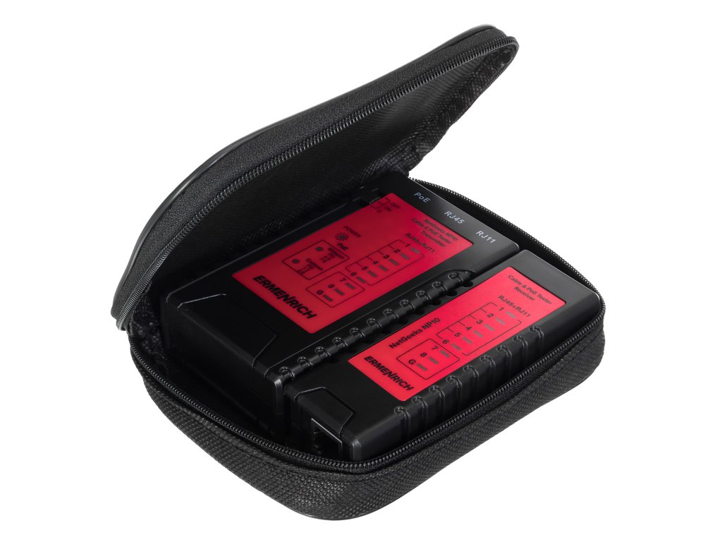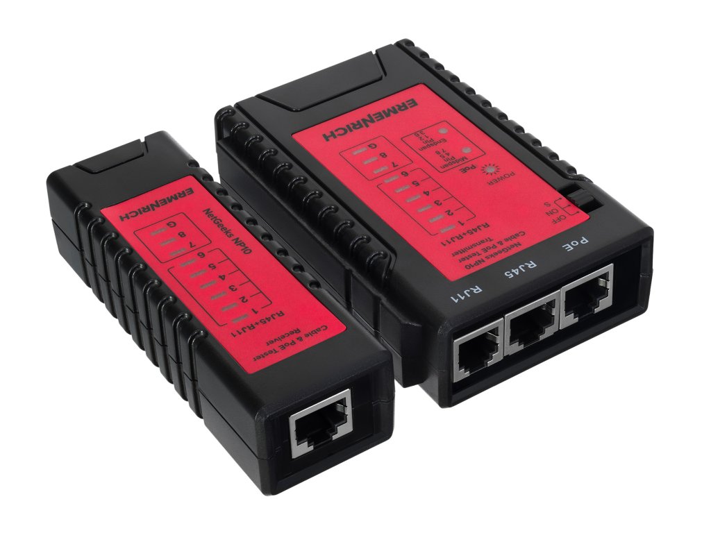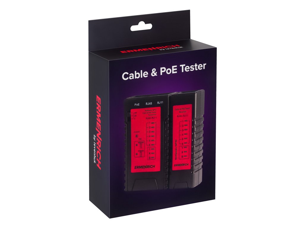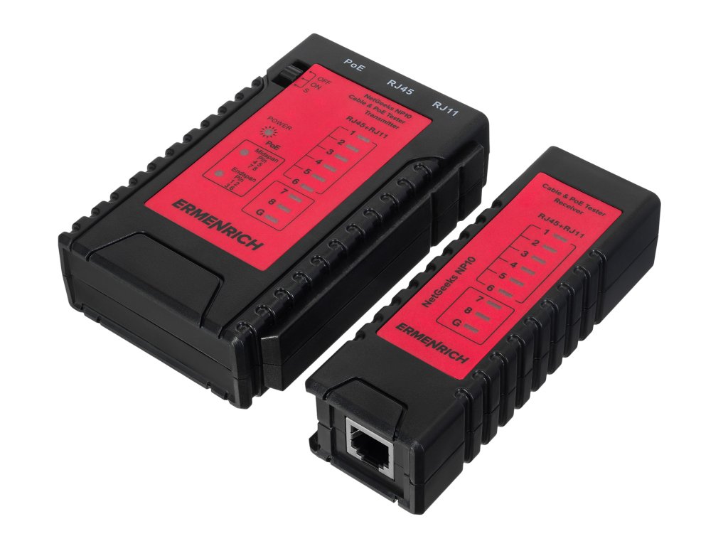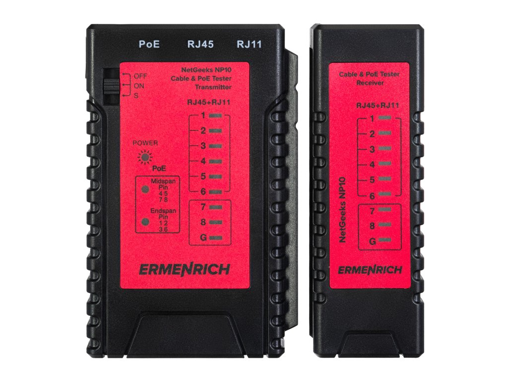 Přístroj Ermenrich NetGeeks NP10 je tester kabelů a PoE určený k testování síťových a telefonních kabelů na přítomnost napájení Ethernetu, přerušených obvodů, zkratů a také k identifikaci umístění napájecího zařízení: buď midspan (střední rozpětí – uprostřed kabelového vedení), nebo endspan (koncové rozpětí – na konci kabelového vedení). Tester se snadno ovládá, má intuitivní ovládání, a proto jej mohou používat jak profesionálové, tak začátečníci.