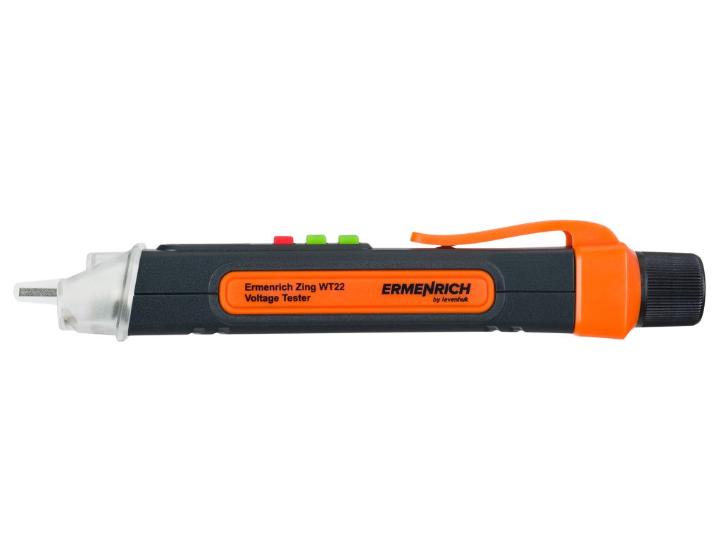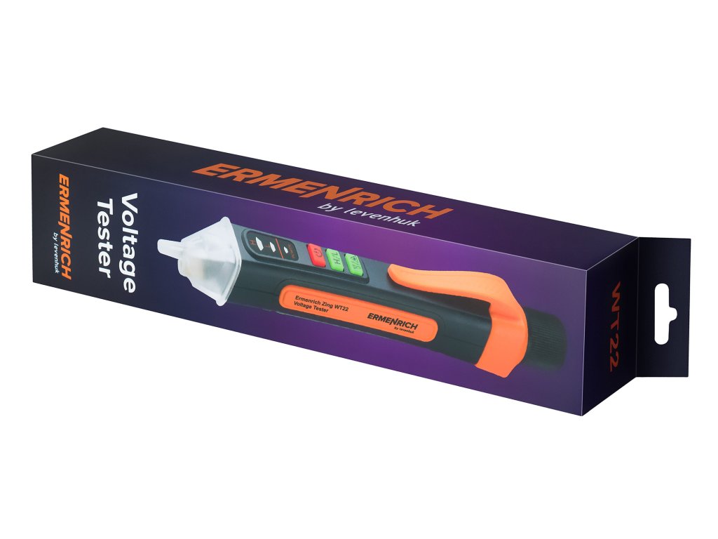 Tester napětí Ermenrich Zing WT22 je bezdotykový detektor, který umožňuje kontrolu přerušení napájecího kabelu, kontrolu funkčnosti zásuvek a detekci napětí v kabelu. To umožní rychle vyřešit řadu problémů ve stavebnictví a při opravách domů. Pokud je přítomno napětí, tester vydá světelnou a zvukovou výstrahu. Citlivost zařízení lze nastavit od nízké (48–1000 V) po vysokou (12–1000 V).