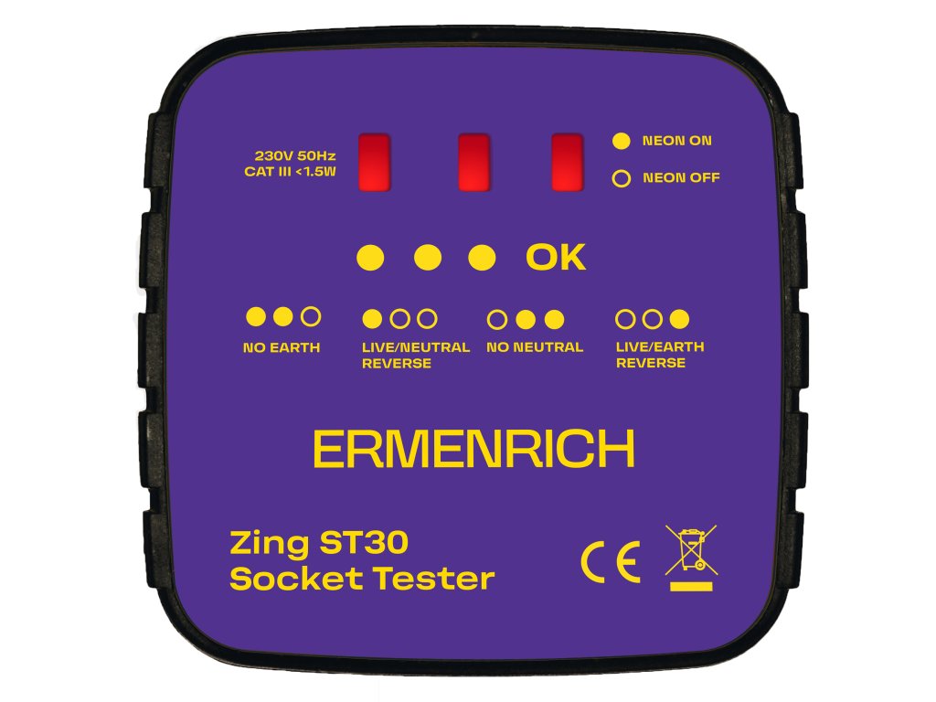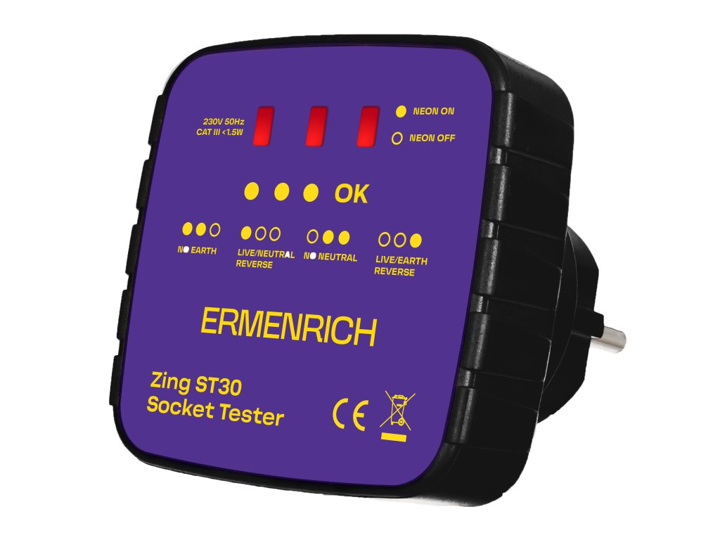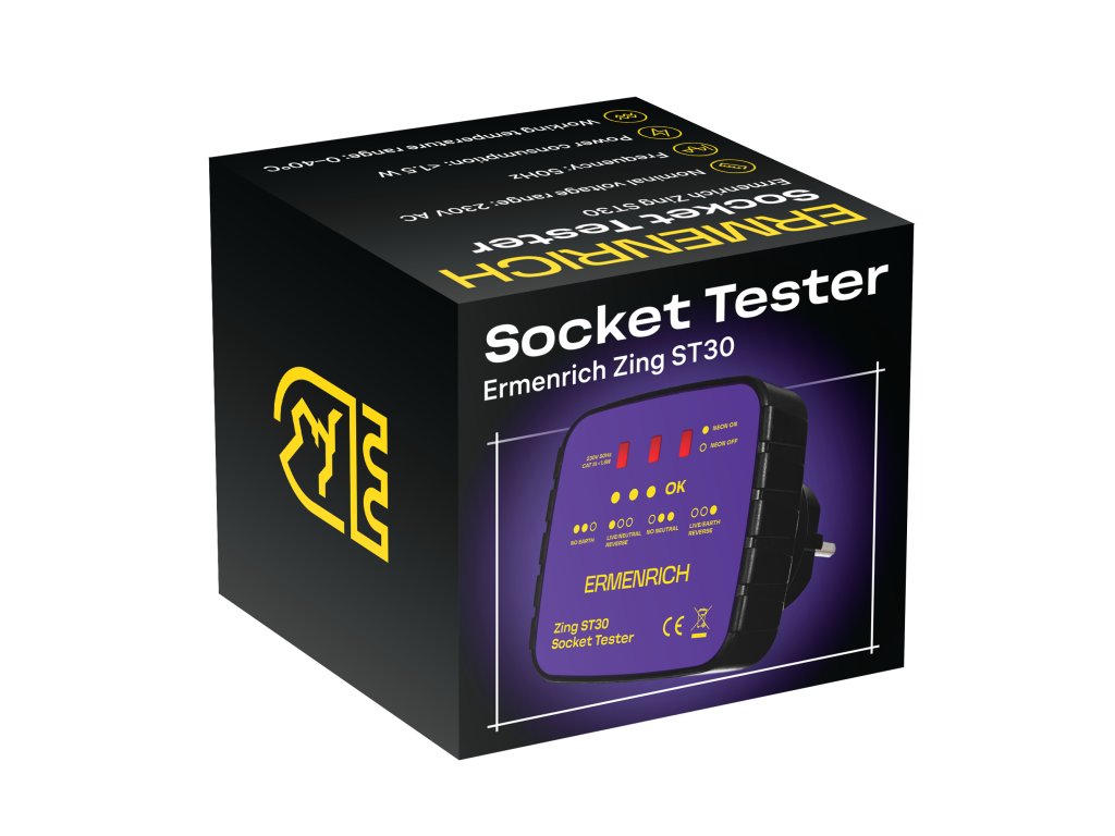 Tester zásuvek Ermenrich Zing ST30 je určen k testování, zda jsou všechny zásuvky správně zapojeny, a ke kontrole napětí. Tester je třeba zapojit přímo do zásuvky a blikání LED kontrolek indikuje různé elektrické závady: chybějící zemnící vodič / chybějící nulový vodič, obrácená polarita fázového a nulového vodiče nebo obrácená polarita fázového a zemnícího vodiče. Kromě toho specifický barevný kód, který se zobrazí na displeji testeru, signalizuje správný stav zapojení. Funkce každého kódu je napsána na přístroji.