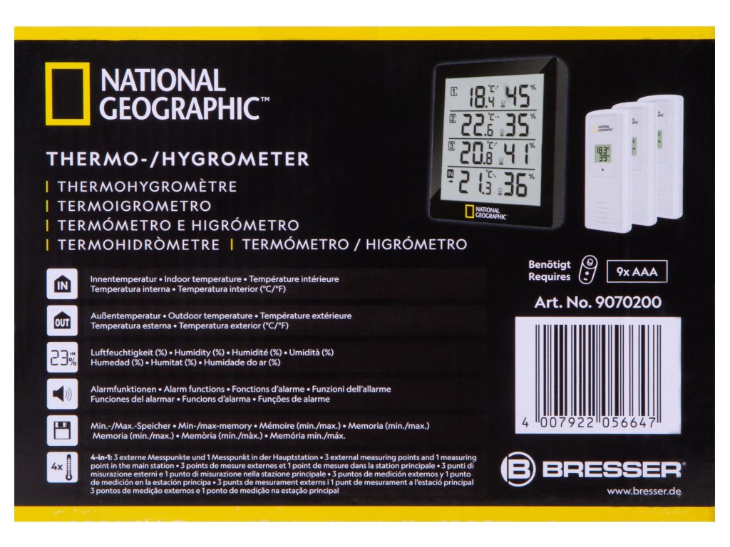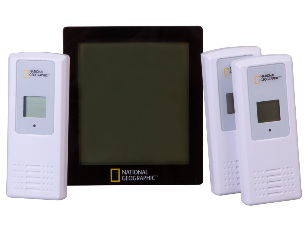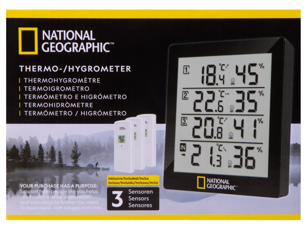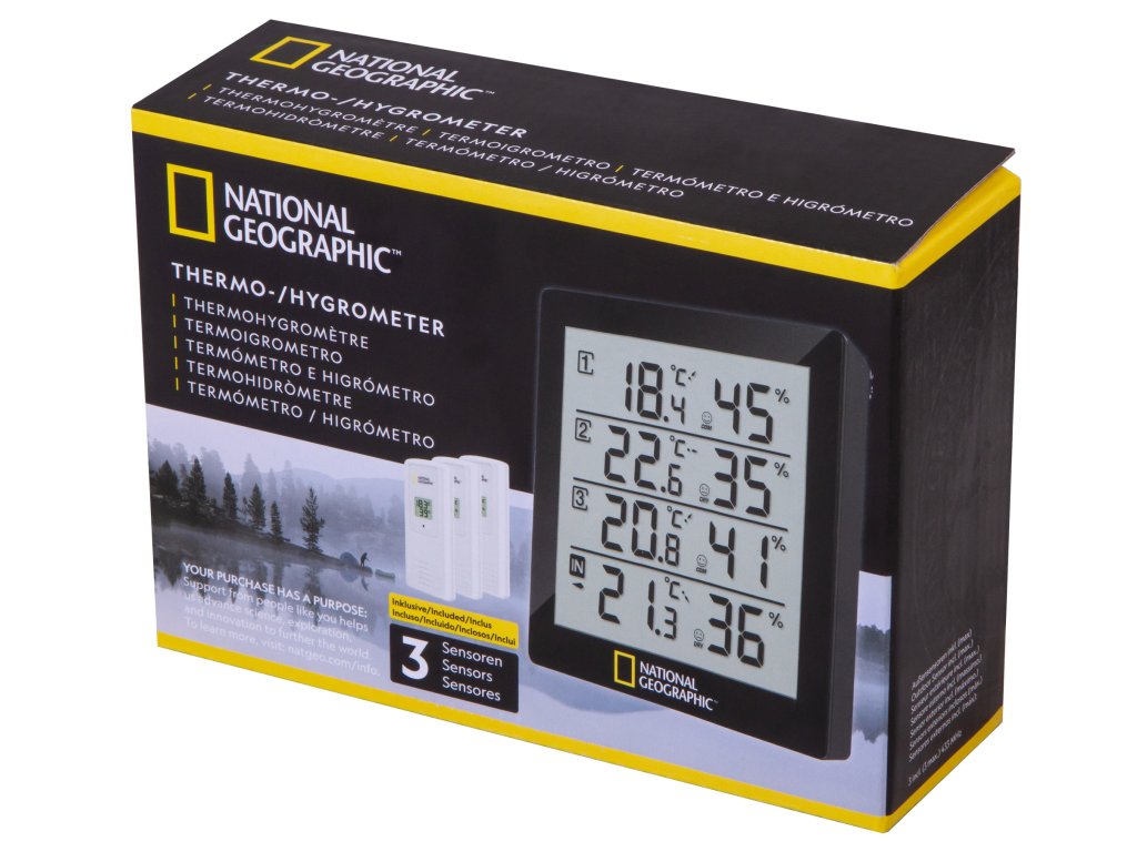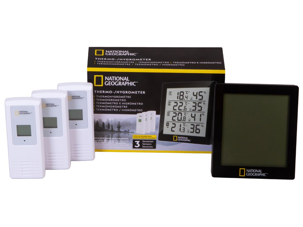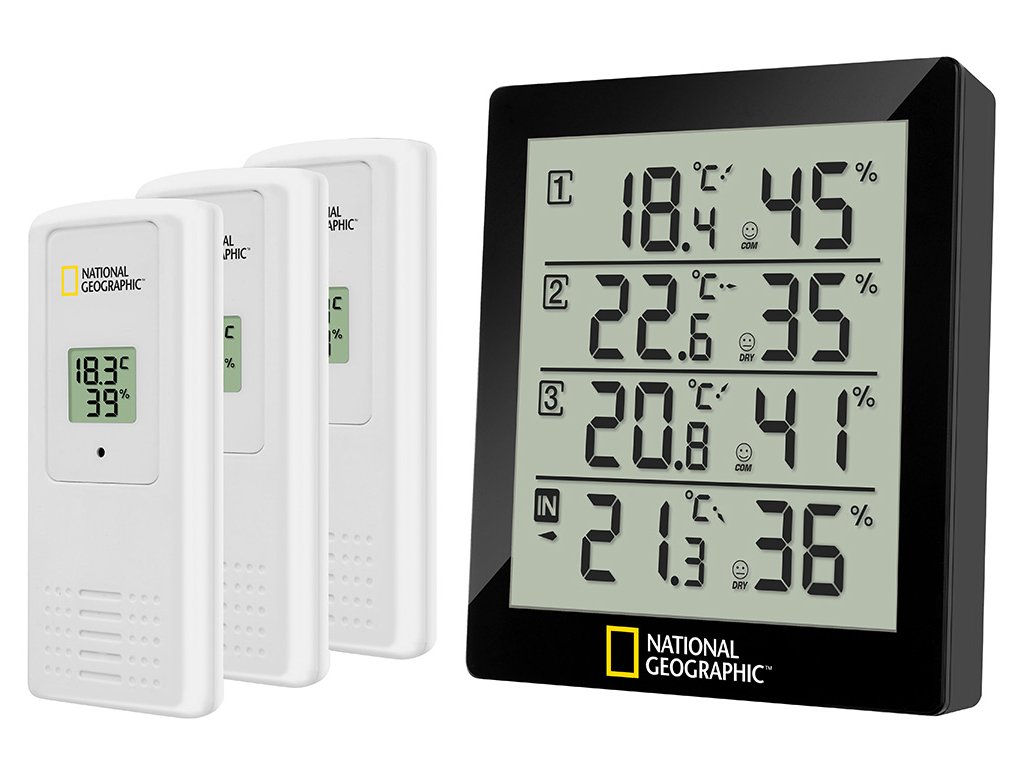 The National Geographic thermo-hygrometer offers the possibility to measure temperature and air humidity in or around your house at 4 different locations, with simple monitoring at one location: Is my cellar room too moist and threatened by mould? Is the children's bedroom temperature all well? Is it too hot on the terrace? There are many more options open.