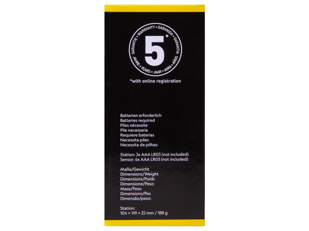 Battery powered by 3x AAA / LR03 batteries (mainstation) and 6x AAA / LR03 batteries (for the three sensors).