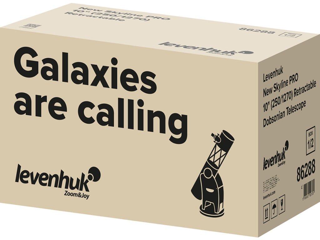 Levenhuk New Skyline PRO 10" je velký a výkonný hvězdářský dalekohled. Navzdory své velikosti a vynikajícímu optickému výkonu však zůstává snadno ovladatelný pro každého. Optický tubus je namontován na stabilní přenosné Dobsonově základně, která má jednoduchou, intuitivní konstrukci s výškovým azimutem pro snadné ruční ovládání. Dvourychlostní 2" hřebenový okulárový výtah s 1,25" adaptérem poskytuje univerzální kompatibilitu s okuláry a přesné ovládání zaostření. Nejvyšší praktické zvětšení přístroje je 500x. Dodávané okuláry Plössl 10 mm a 25 mm (1,25") poskytují zvětšení 127x a 51x.