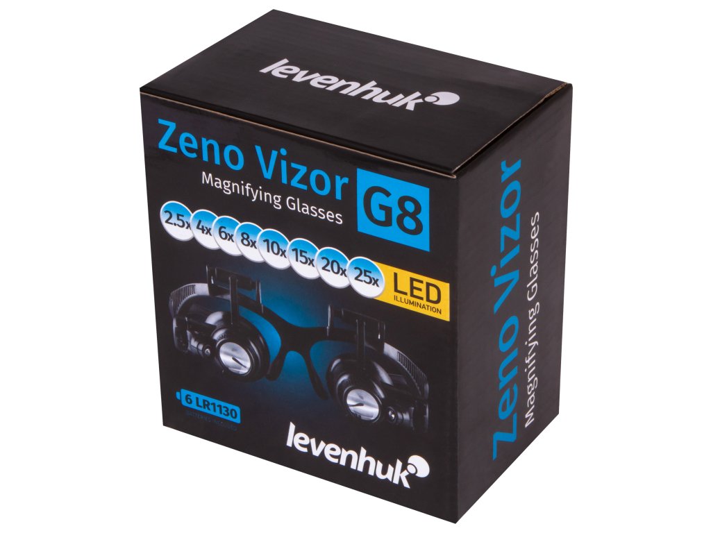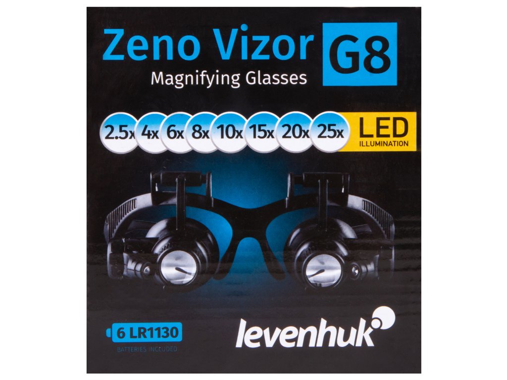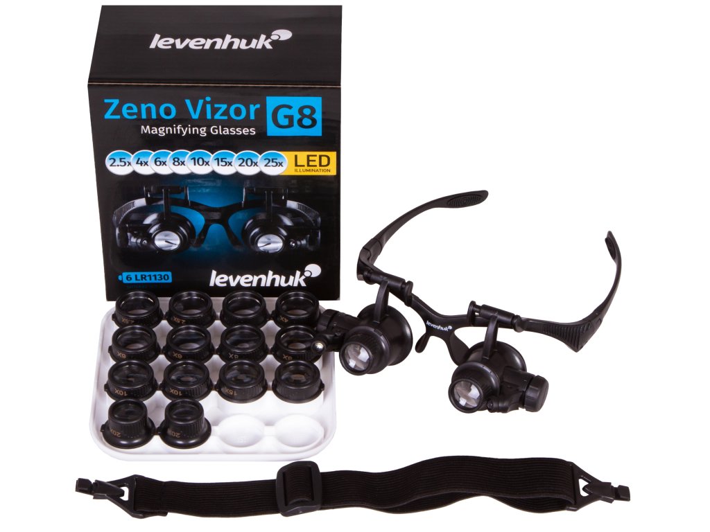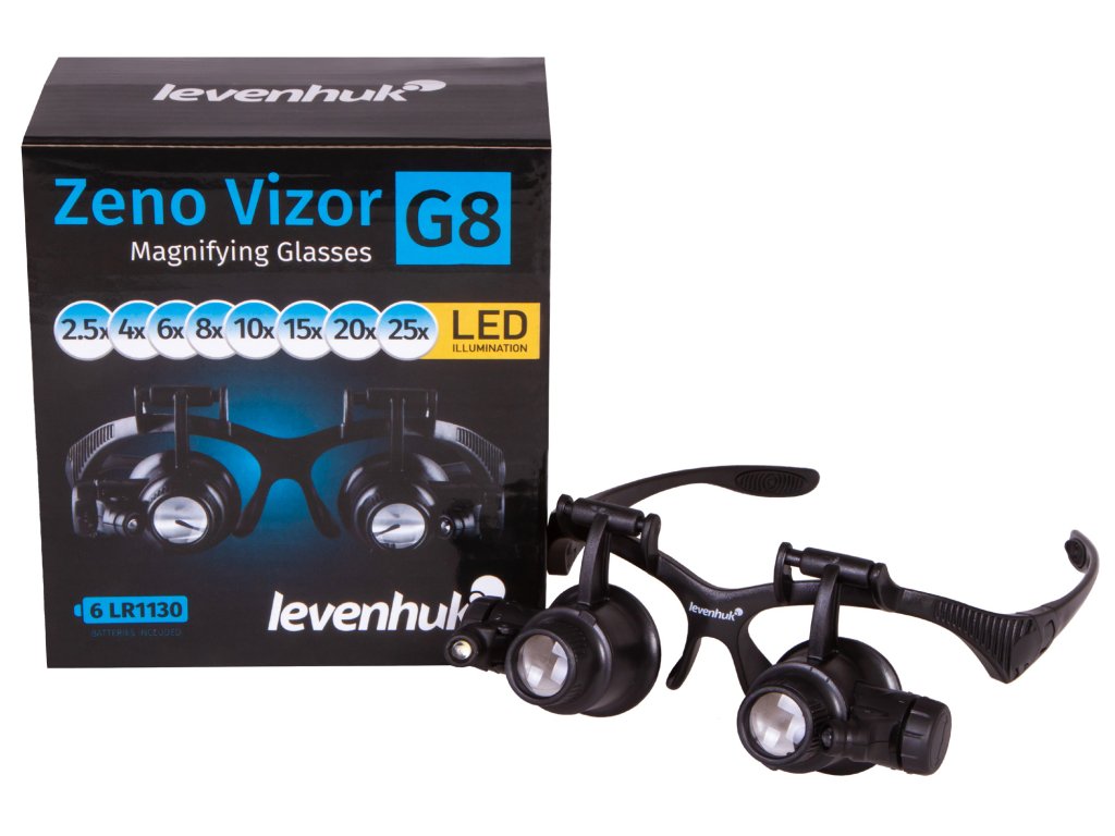 Zvětšovací brýle Levenhuk Zeno Vizor G8 jsou zvětšovací nástroj, který je vysoce ceněn klenotníky a opraváři hodinek. Tyto zvětšovací brýle jsou vybaveny čelenkou a brýlovými obroučkami. Nemusíte je držet rukama a čočky zůstávají vždy před očima. Tato sada obsahuje 8 sad čoček s různým zvětšením. Celkový rozsah zvětšení zvětšovacích brýlí je od 2,5x do 25x.